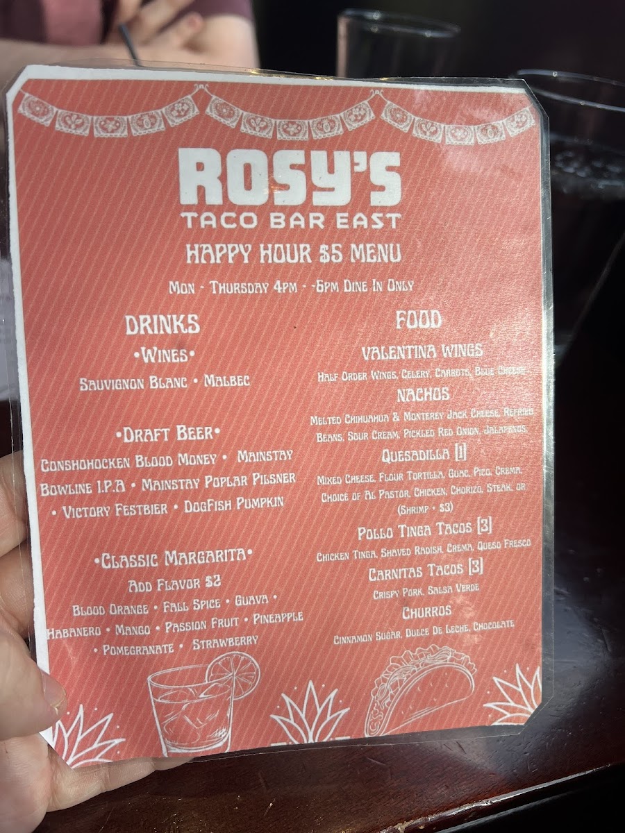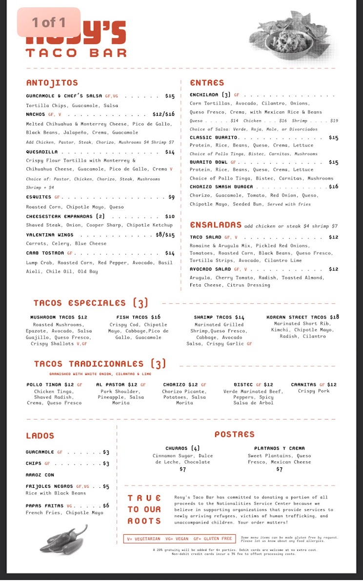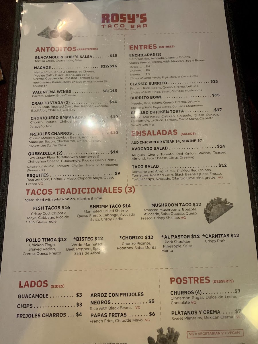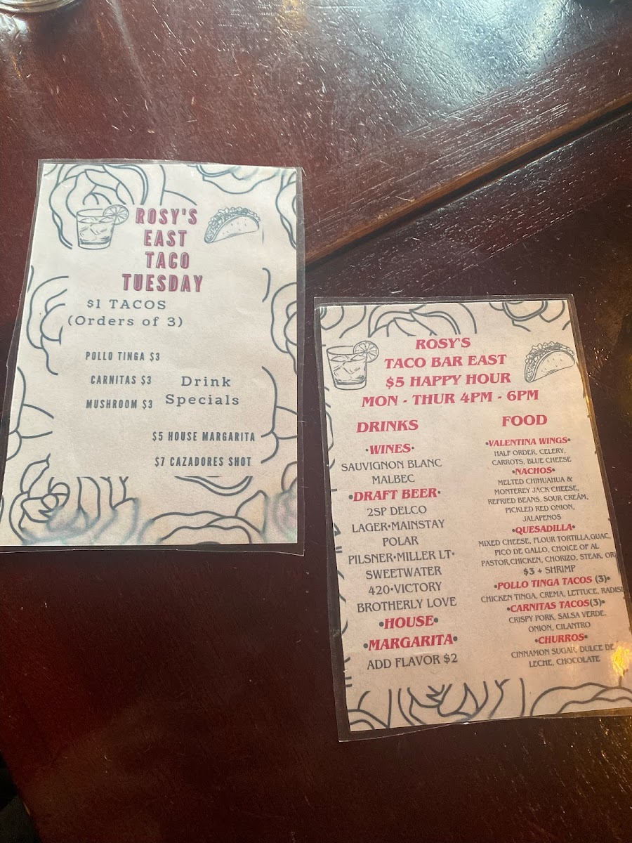 From a reviewer’s perspective, the menu at Rosy’s Taco Bar East offers a lively and satisfying mix of Mexican street-food favorites, even though pricing details aren’t explicitly listed. The Antojitos section stands out with shareable starters like Guac And Salsa, Esquites, Small Nachos, Large Nachos, and Valentina Wings, perfect for kicking off the meal. The taco selection is a highlight, featuring flavorful options such as Fish Tacos, Shrimp Tacos, Mushroom Tacos, Pollo Tinga Tacos, and Bistec Tacos, each delivering a distinct taste profile. For heartier options, the Entrees like Queso Enchiladas, Chicken Enchiladas, Shrimp Enchiladas, Burrito, and Burrito Bowl provide comforting, filling choices, while lighter fare like the Taco Salad balances the menu. Sides such as Arroz Con Frijoles, Papas Fritas, Side Of Rice, Side Beans, and Side Guacamole complement any dish, and the dessert offerings-especially Churros and Flan-add a sweet finish. Drinks like Jarritos Soda, Mexican Coke, and creative Rosys Classic Non-Alcoholic Margarita Kit or Rosys Blood Orange Non-Alcoholic Margarita Kit round out the experience, alongside a variety of hot sauces including Rosy’s Hot Sauce. Overall, the menu feels diverse, approachable, and well-suited for both casual bites and full meals.