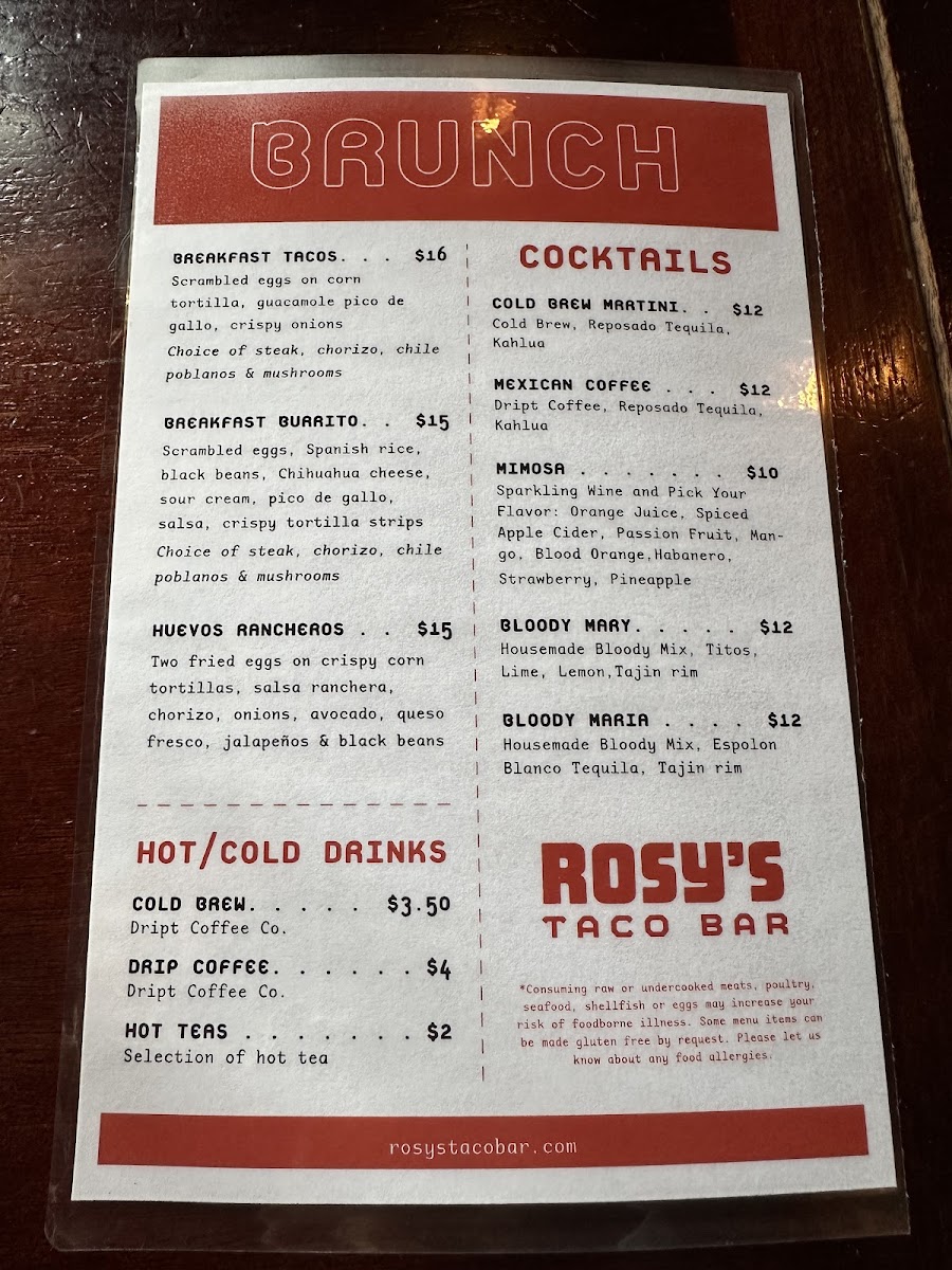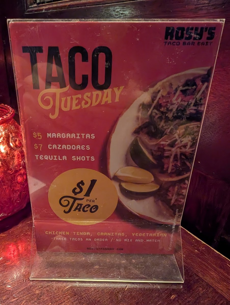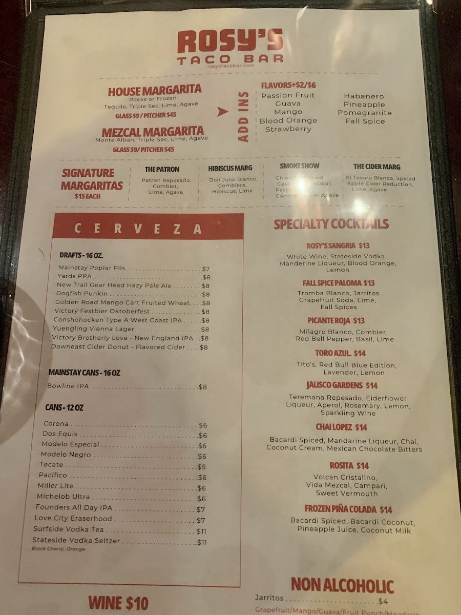 From a reviewer’s perspective, the menu at Rosy’s Taco Bar East offers a lively and satisfying mix of Mexican street-food favorites, even though pricing details aren’t explicitly listed. The Antojitos section stands out with shareable starters like Guac And Salsa, Esquites, Small Nachos, Large Nachos, and Valentina Wings, perfect for kicking off the meal. The taco selection is a highlight, featuring flavorful options such as Fish Tacos, Shrimp Tacos, Mushroom Tacos, Pollo Tinga Tacos, and Bistec Tacos, each delivering a distinct taste profile. For heartier options, the Entrees like Queso Enchiladas, Chicken Enchiladas, Shrimp Enchiladas, Burrito, and Burrito Bowl provide comforting, filling choices, while lighter fare like the Taco Salad balances the menu. Sides such as Arroz Con Frijoles, Papas Fritas, Side Of Rice, Side Beans, and Side Guacamole complement any dish, and the dessert offerings-especially Churros and Flan-add a sweet finish. Drinks like Jarritos Soda, Mexican Coke, and creative Rosys Classic Non-Alcoholic Margarita Kit or Rosys Blood Orange Non-Alcoholic Margarita Kit round out the experience, alongside a variety of hot sauces including Rosy’s Hot Sauce. Overall, the menu feels diverse, approachable, and well-suited for both casual bites and full meals.
